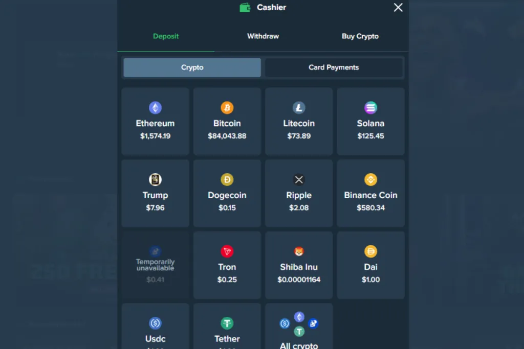 Wejdź do sekcji wpłat i wybierz kryptowalutę, którą chcesz wpłacić.
